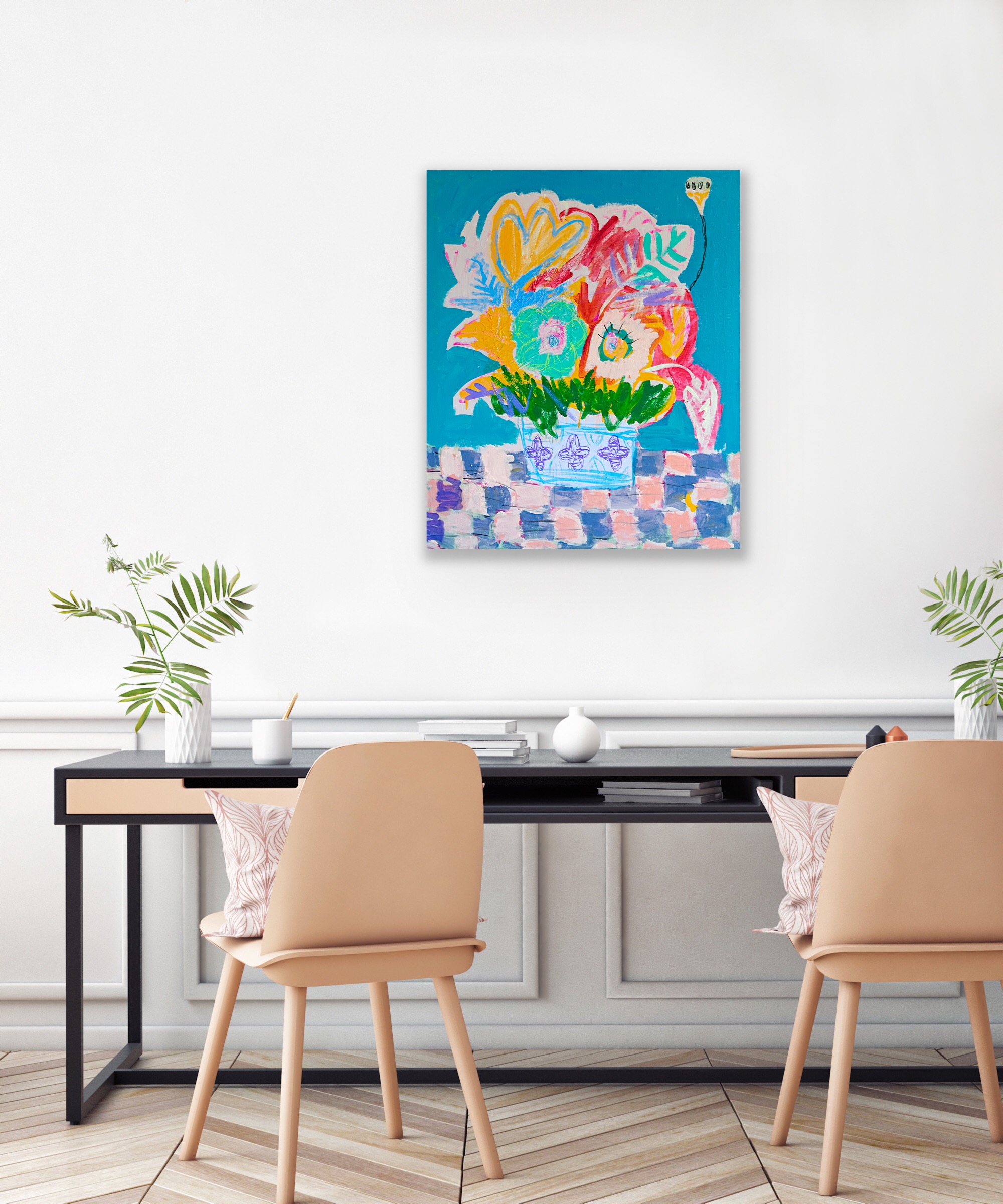 Ramirez’s Flower Series could be considered his most recognized subject matter aside from Totchi. Through his automated style of painting, the artist draws inspiration from both impressionism and abstract expressionism while implementing bright colors which allude to his tropical origins. The artist also utilizes unorthodox material such as tissue paper, which bleeds colors when moistened with fresh paint: this characteristic creates chance textures and color combinations. Ramirez’s intrinsic inspiration for these works stems from feminine beauty and positive emotions he attributes to the powerful women who surround him in his daily life.